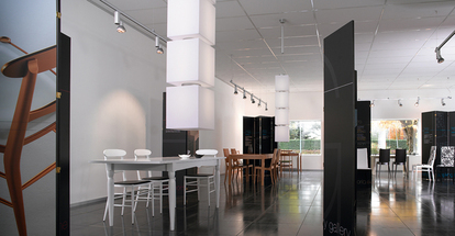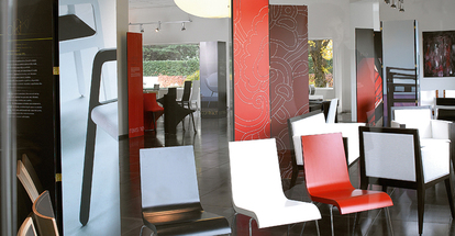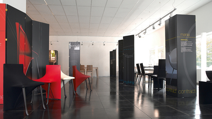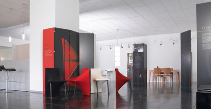 page realizes the project of an exhibition space with fan-shaped mobile panels that tell the productive details of handmade design chairs